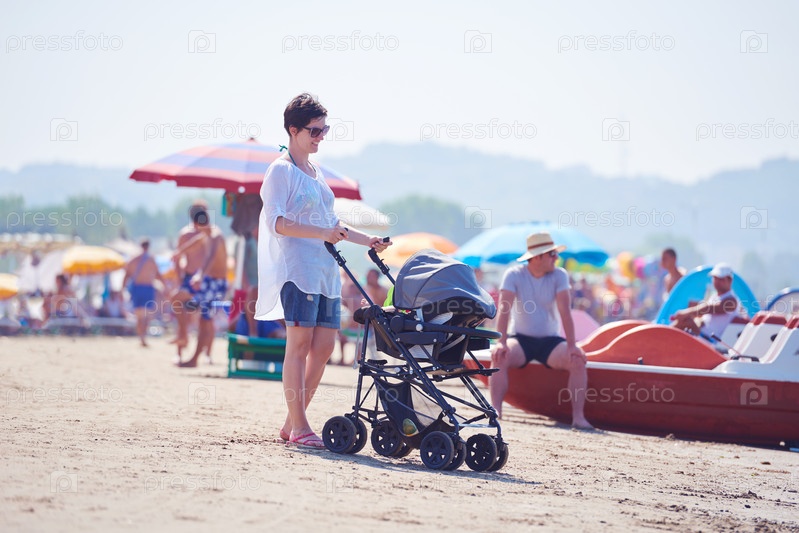 Мать, на пляже с коляской