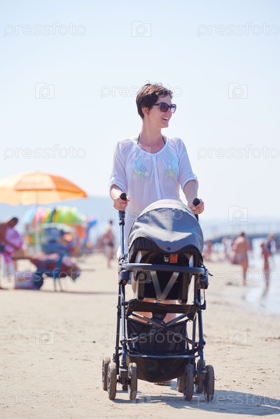 Мать, на пляже с коляской