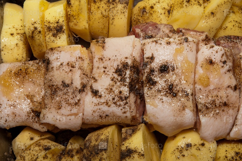 Куски свежей свинины и кружки картофеля на противне. Крупный план