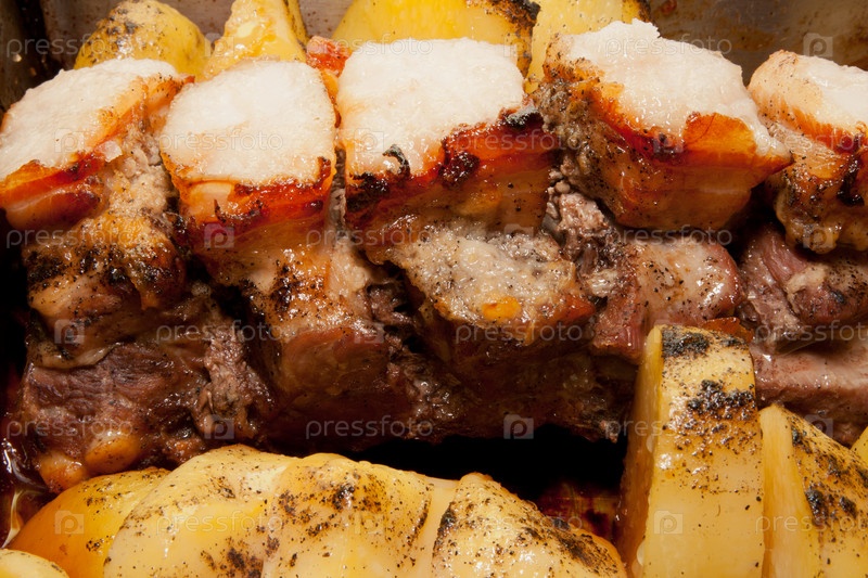 Аппетитное жаркое из свинины и картофеля на противне. Крупный план