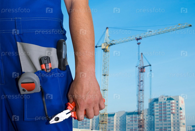 Строитель с плоскогубцами на фоне здания