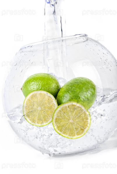 Зеленый лайм в воде, изолировано на белом
