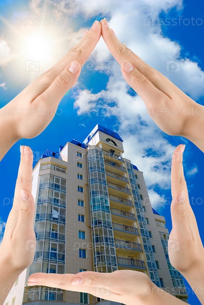 Руки, изображающие контур дома на фоне современного здания