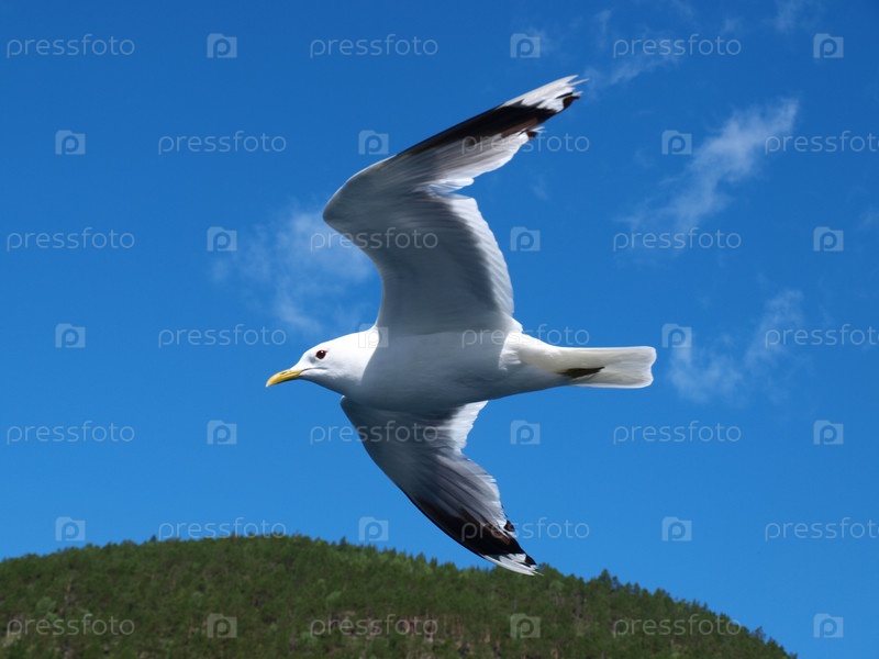 Чайка летит в голубом небе