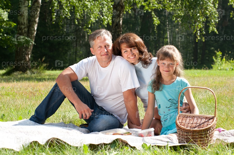 Счастливая семья на пикнике в летнем парке