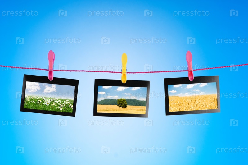 Фотографии с изображением природы висят на цветных прищепках на голубом фоне