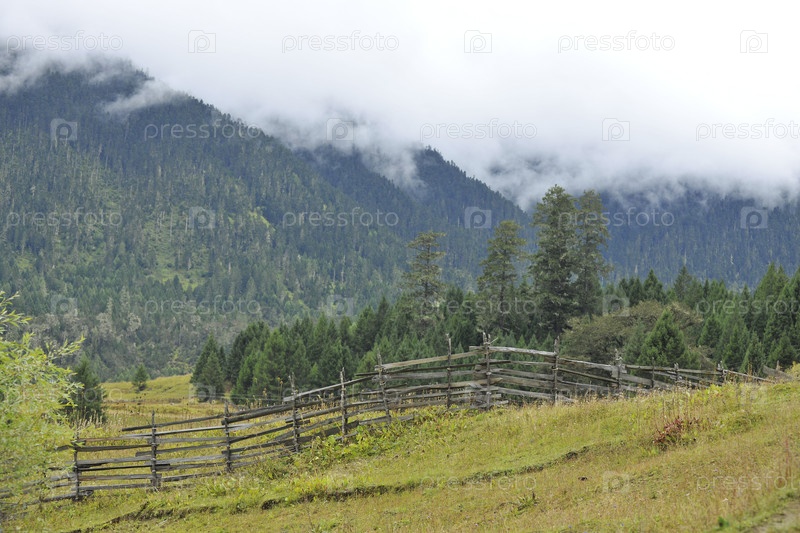 Пастбище на фоне туманной горы