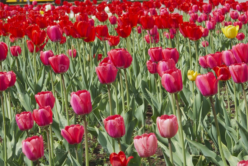 Поле красных тюльпанов весной