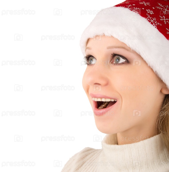 Удивленная молодая девушка в колпаке Санта-Клауса на белом фоне