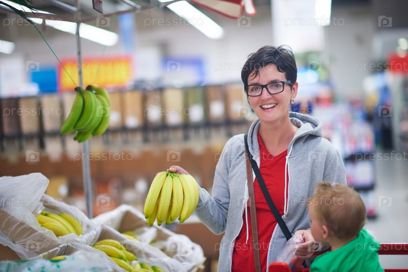 Мать с ребенком покупают бананы