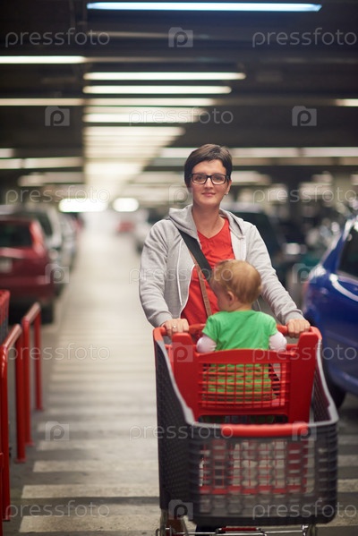 Мать с ребенком на парковке супермаркета