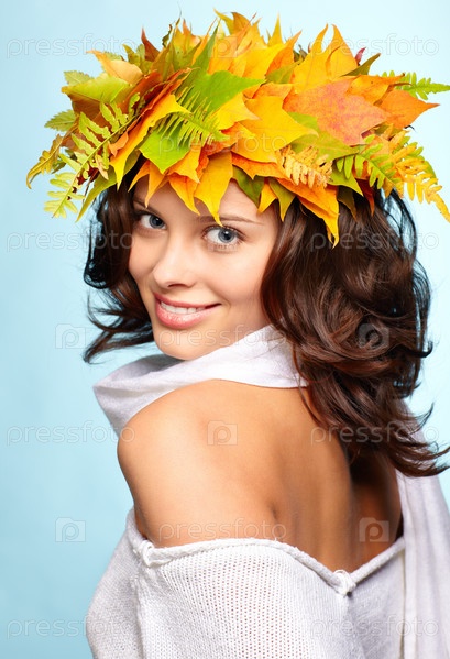Девушка с венком из осенних кленовых листьев на голове