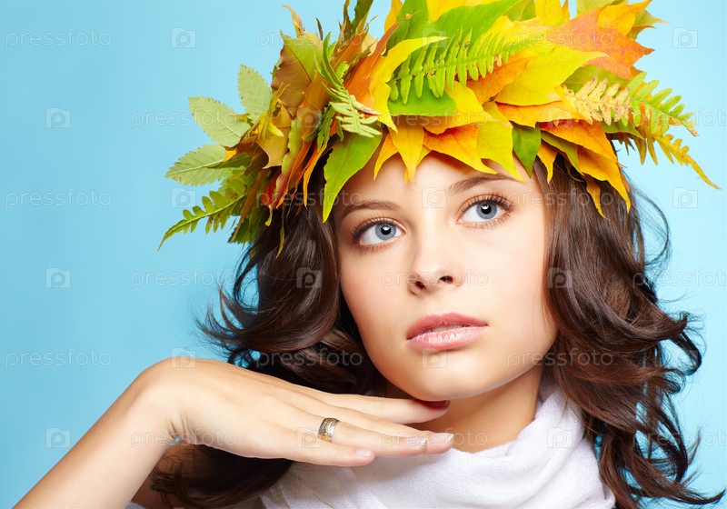 Молодая брюнетка с венком из осенних листьев клена и папоротника
