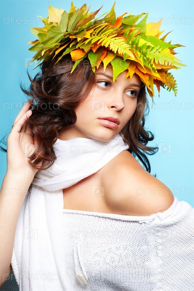Молодая брюнетка с венком из осенних листьев клена и папоротника