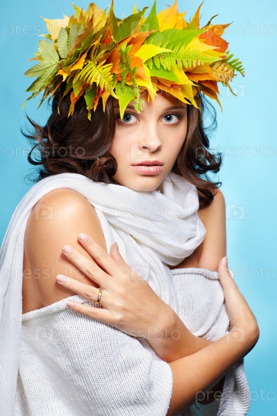 Молодая брюнетка с венком из осенних листьев клена и папоротника