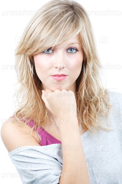 Молодая решительная женщина на белом фоне