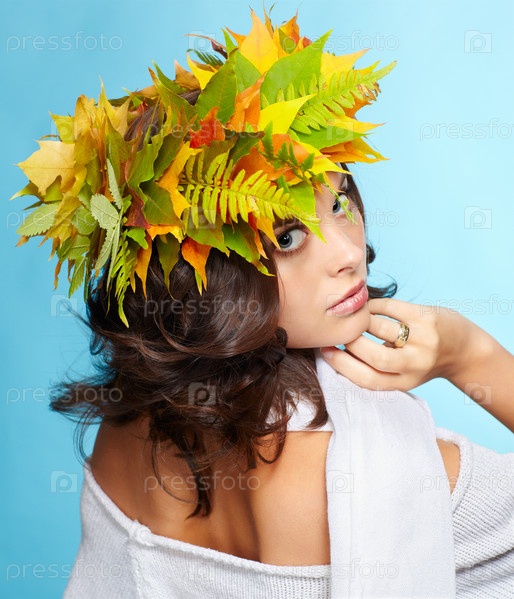 Молодая брюнетка с венком из осенних листьев клена и папоротника