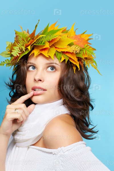 Молодая брюнетка с венком из осенних листьев клена и папоротника