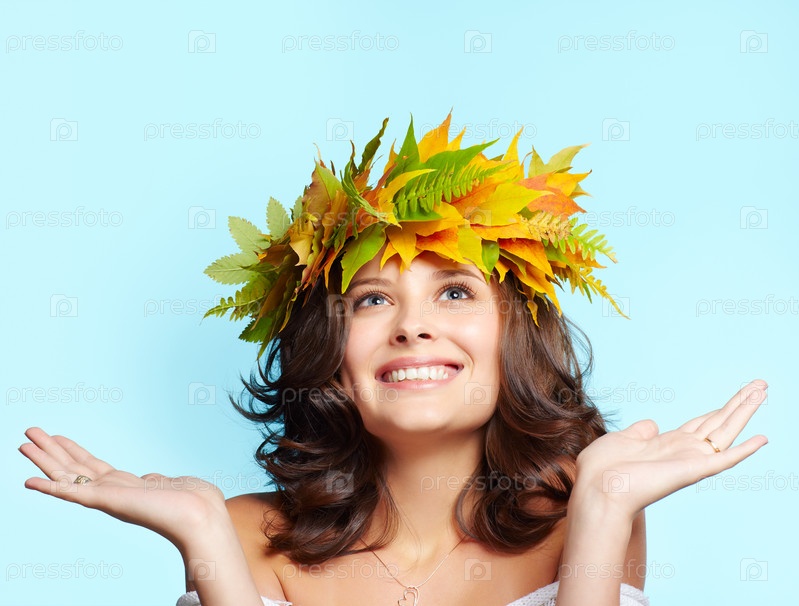 Молодая брюнетка с венком из осенних листьев клена и папоротника