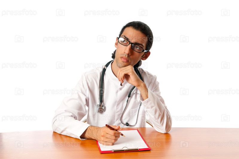 Врач с планшетом за столом на белом фоне