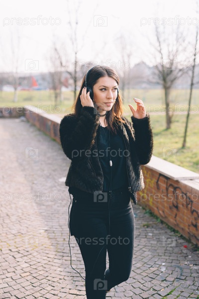 Молодая красивая женщина, слушать музыку с наушниками