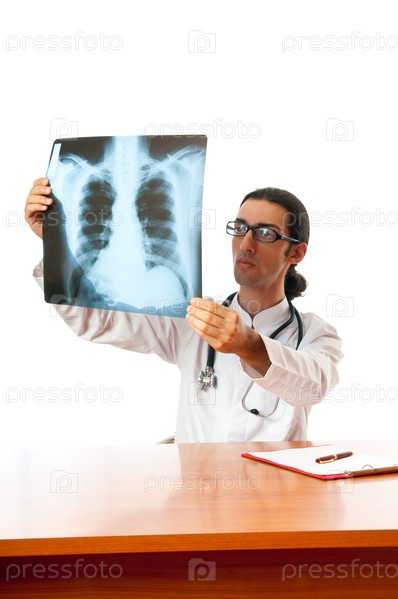 Врач с рентгеновским снимком за столом на белом фоне