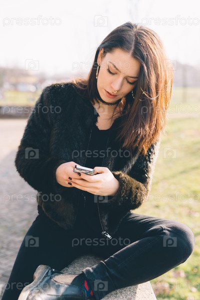 Молодая красивая женщина, с помощью смартфона