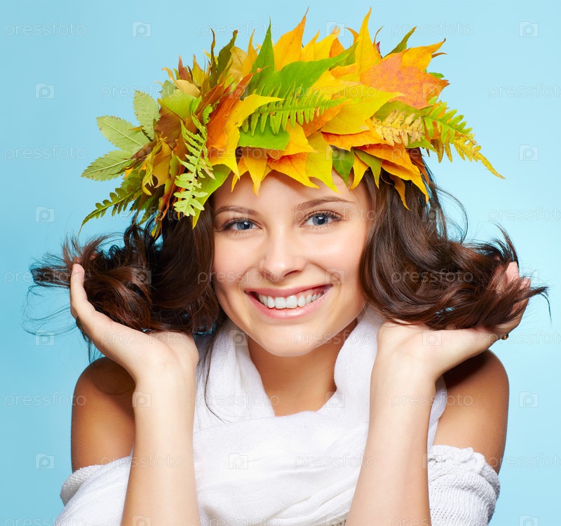 Молодая брюнетка с венком из осенних листьев клена и папоротника