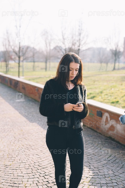 Молодая красивая женщина, с помощью смартфона