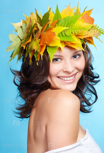 Молодая брюнетка с венком из осенних листьев клена и папоротника