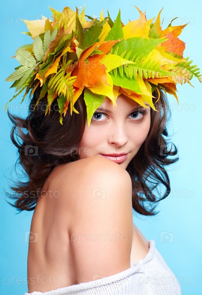 Молодая брюнетка с венком из осенних листьев клена и папоротника