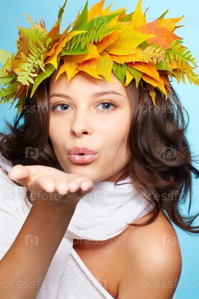 Молодая брюнетка с венком из осенних листьев клена и папоротника