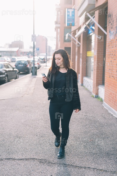 Молодая красивая женщина, с помощью смартфона