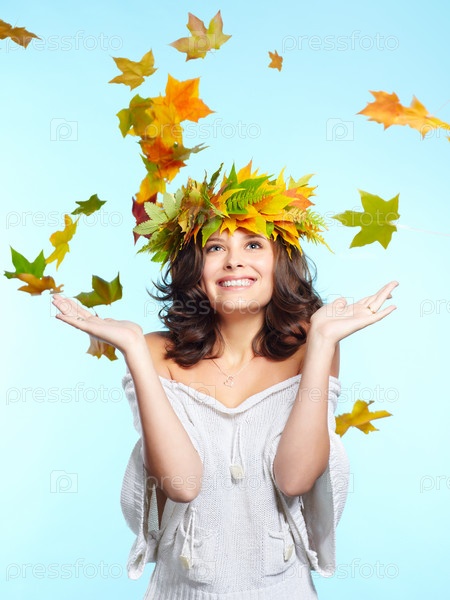 Молодая брюнетка с осенними листьями