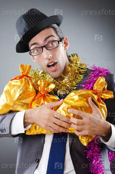 Бизнесмен с мешками подарков на темном фоне