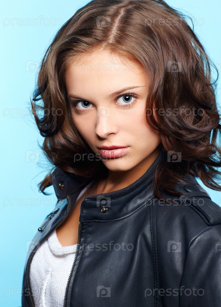 Портрет молодой брюнетки в черной кожаной куртке на голубом фоне