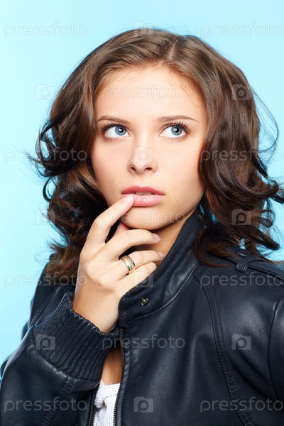 Портрет молодой брюнетки в черной кожаной куртке на голубом фоне