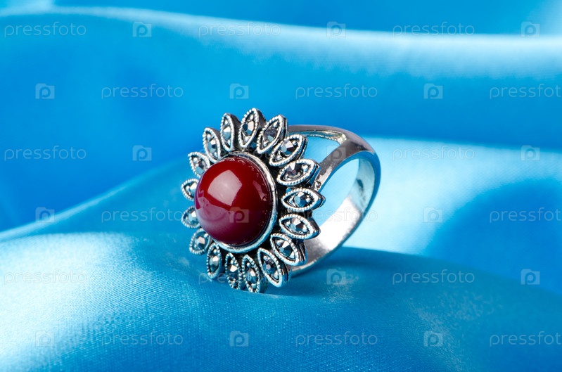 Красивое кольцо с натуральным камнем на голубом фоне