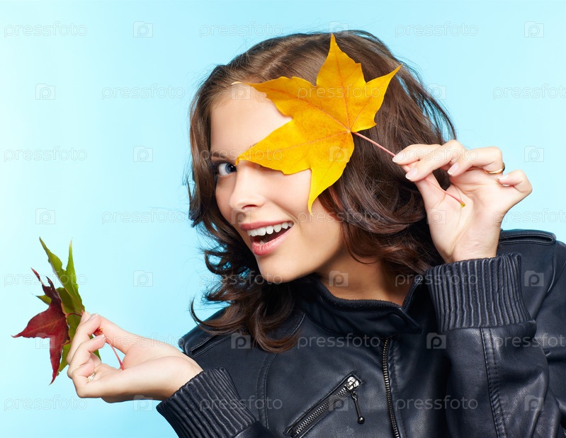 Молодая брюнетка в черной кожаной куртке с осенним кленовым листом