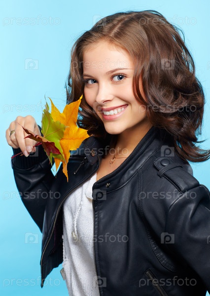 Молодая брюнетка в черной кожаной куртке с осенними листьями
