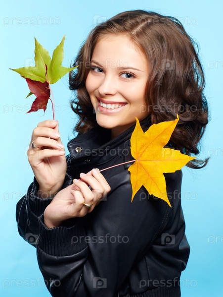 Молодая брюнетка в черной кожаной куртке с осенними листьями