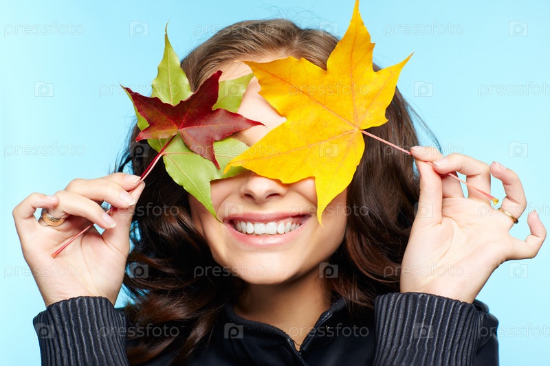 Молодая брюнетка в черной кожаной куртке с осенними листьями
