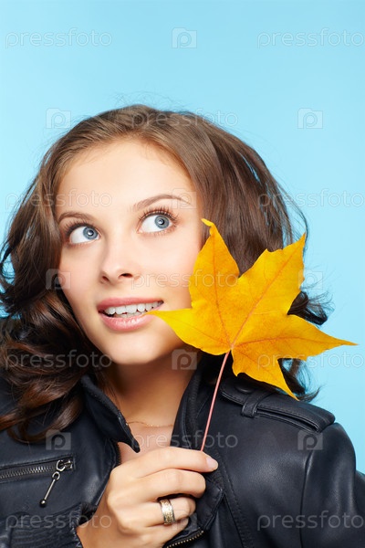 Молодая брюнетка в черной кожаной куртке с осенним кленовым листом