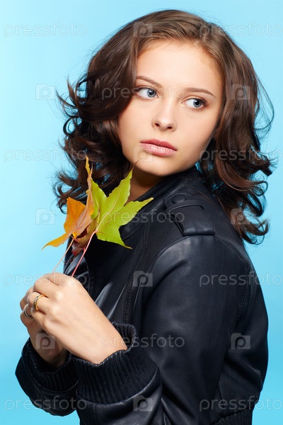 Девушка в кожаной куртке с осенними листьями