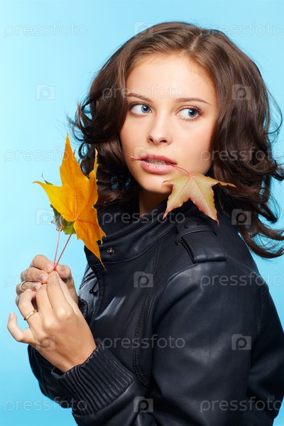 Девушка в кожаной куртке с осенними листьями
