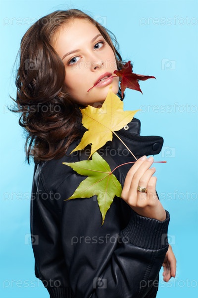 Девушка в кожаной куртке с осенними листьями