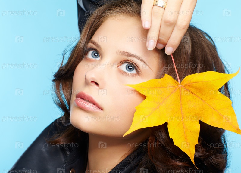 Девушка в кожаной куртке с осенним кленовым листом