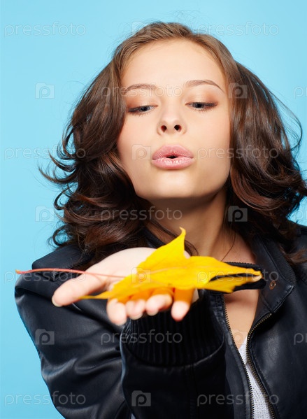 Девушка в кожаной куртке с осенним кленовым листиком на ладони