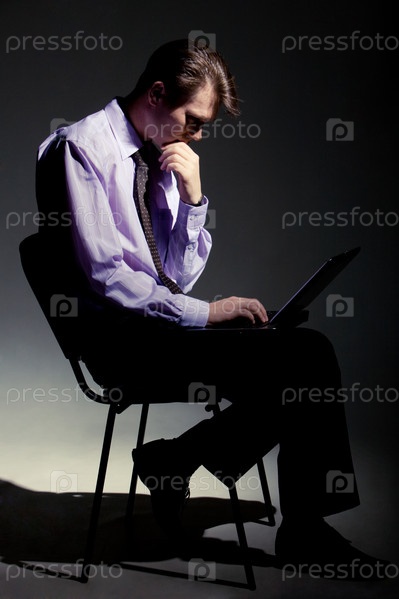 Изображение бизнесмена, сидящего в темной комнате и смотрящего на ноутбук во время размышлений