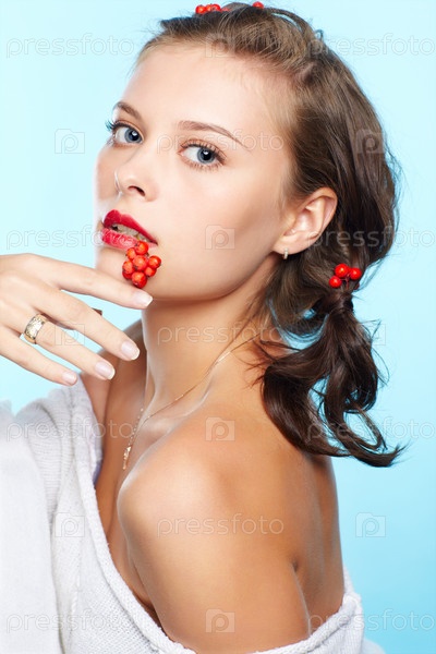 Портрет молодой брюнетки с ягодами красной рябины